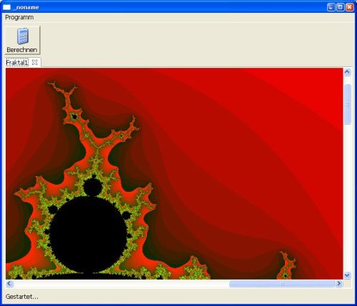 Dem Berechnen-Button wurde endlich ein Icon verpasst und Funktionalität hinterlegt. Wenn der Button gedrückt wird, wird das Fraktal neu berechnet. Und schon stehe ich wieder vor einem neuen Problem, dass kein Neues ist: Wenn ich auf den Button berechnen drücke, soll der Text der Statuszeile auf „Rechne…“ gesetzt werden und sobald er fertig ist, wieder auf „Fertig…“. Das Problem äußert sich dann wie folgt: Es bleibt „Gestartet…“ stehen, er rechnet und wenn er fertig ist, blitzt kurz was auf und dann steht „Fertig…“ da. Woran liegt das? Stichwort: Eventqueue. Wenn der Button gedrückt wird, geht das Programm in den dafür vorgesehenen Zweig der Eventbearbeitung. Solange der Event abgearbeitet wird, müssen andere Events warten. So auch die Events, die das Neuzeichnen der Statuszeile veranlassen.