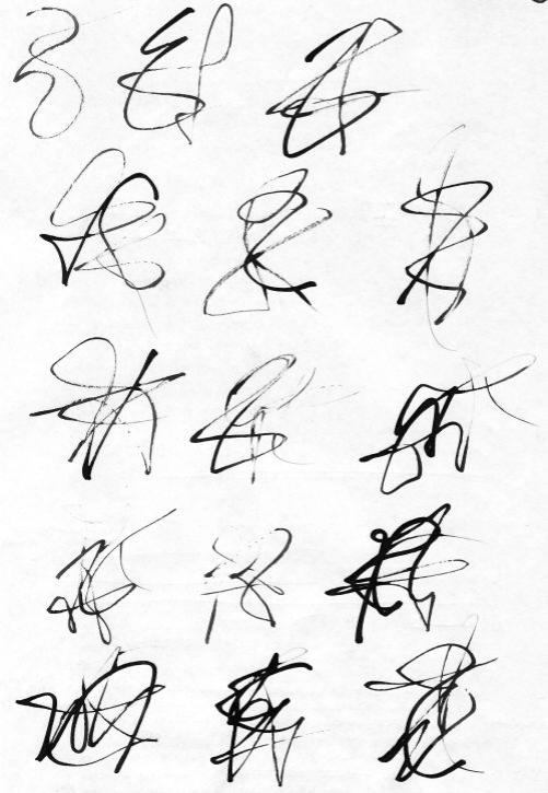 Bitte nicht über den Hintergrund auf dem Bild wundern, ich übe auf Schmierpapier. Aber trotzdem hab ich zum Vergleich sämtliche Arbeiten aufgehoben, da man sich so am nächsten Tag die Übungen des letzten Tages wieder in Erinnerung rufen kann und so eventuelle Fehler ausmerzen kann. Danach folgten noch ein paar erste Versuche mit Tinte, die ich doch lieber weg lasse 😉 Am besten gleich zum nächsten Tag übergehen, wo ich mich der nächsten Aufgabe stellte. Herausforderung: Arbeiten mit Tinte, schnelle Federführung, keine identischen Zeichen schreiben, keine Buchstaben. Und so ein ganzes Blatt voll…