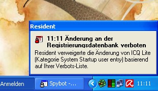 Da mich die Performance meines System etwas störte, entschloss ich mich zu einer kompletten Neuinstallation. Dabei lud ich mir auf eine neue Version von Spybot S & D herunter, die jetzt mit einem Hintergrundprogramm ausgestattet ist, was Änderungen in der Registry überwacht. Und als ich dann ICQ installierte, schlug das Programm an und meldete den Versuch, das ICQ versucht, sich beim Systemstart mitzustarten. So, so… also doch kein Bug, sondern vorsätzlich. Denn mit jedem Start von ICQ versucht es dieses Programm immer wieder, sich einzutragen.