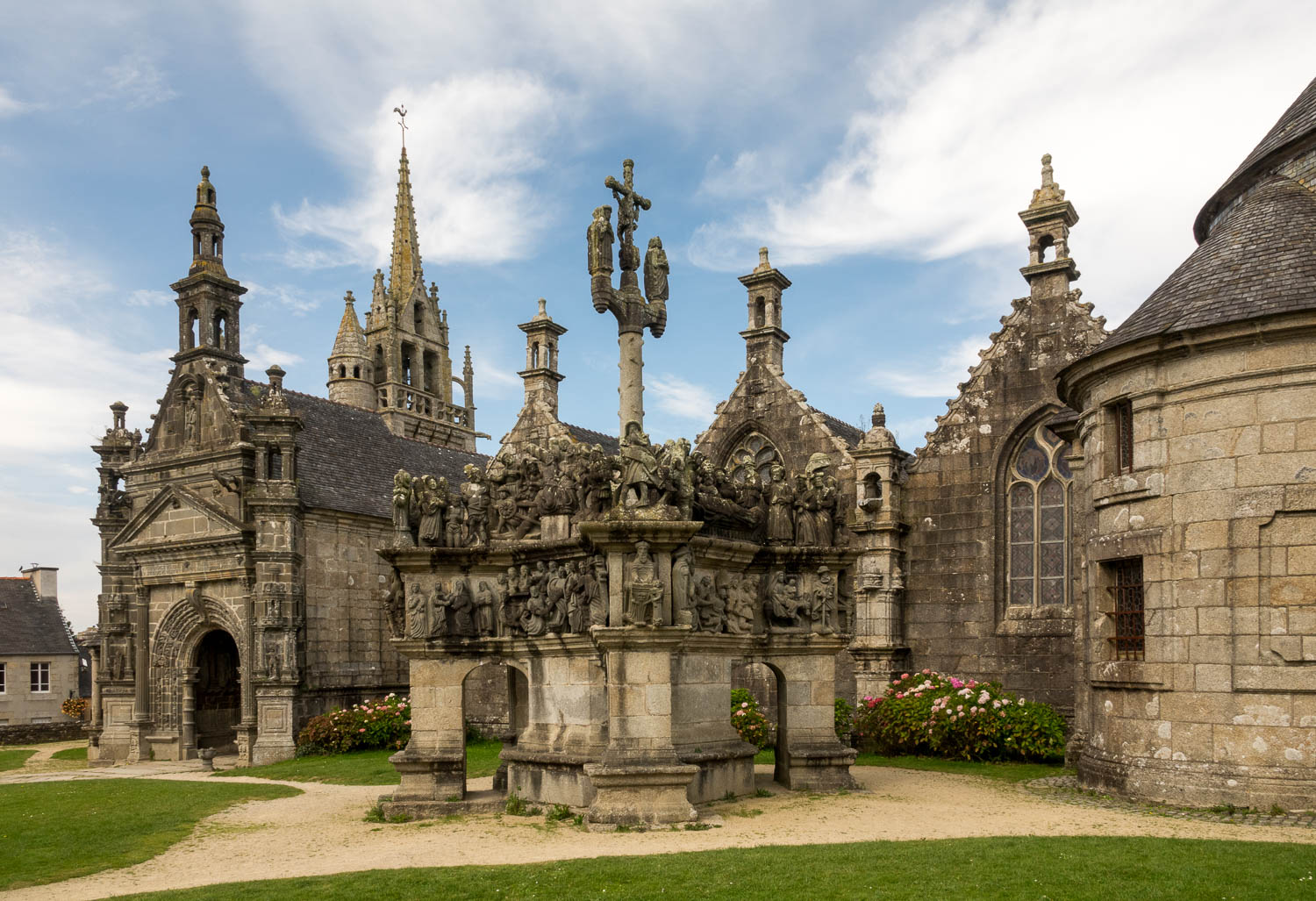 In Guimiliau finden wir den bedeutendsten umfriedeten Pfarrbezirk in der Bretagne. An der Kirche finden sich zahlreiche Reliefs, welche die biblische Geschichte zeigen. Interessant ist dabei die Darstellung der Figuren, wie ich sie bisher noch nie gesehen habe.
