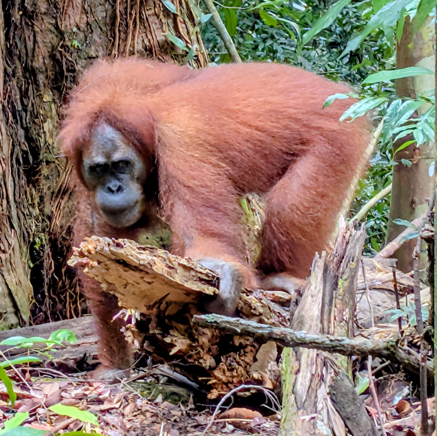Der nächsten Morgen startete bewölkt und ich war froh, dass es nicht so brennend heiß war. Unser Guide hatte mit uns schon am Vortag gesprochen und alles erklärt. Wir liefen kurz vor 9 Uhr los. Keine halbe Stunde sahen wir Thomas Languren, auch als Punky Monkey bekannt. Eine halbe Stunde später der erste Orang-Utan, der in einer Liane saß und gemütlich eine Frucht verdrückte.