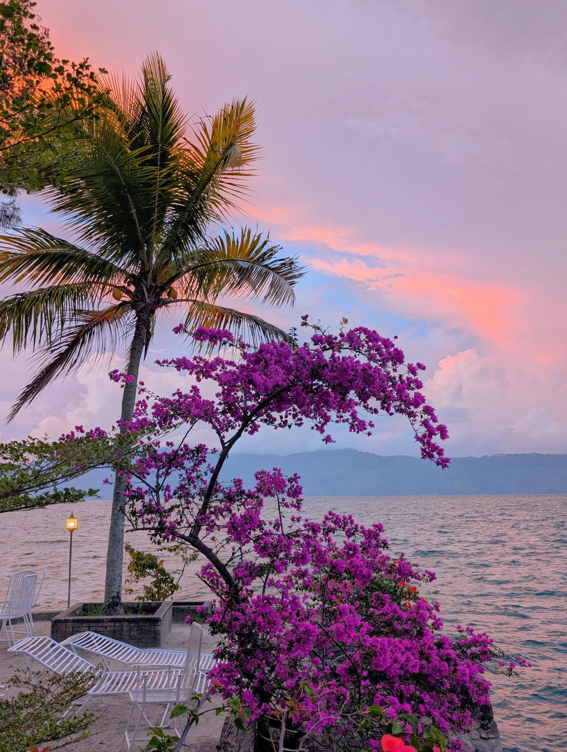 Wir liefen etwas durch den Ort, suchten uns ein Restaurant aus und bei Bier und Gado-Gado schauten wir auf den See. Nach dem Essen gingen wir zurück zum Hotel. Wir machten einen Fotowettbewerb. Wer fängt die Schönheit des Sees / Hotels mit den rosa Abendwolken am besten ein. Gewinner gab es keinen, aber viele tolle Fotos.