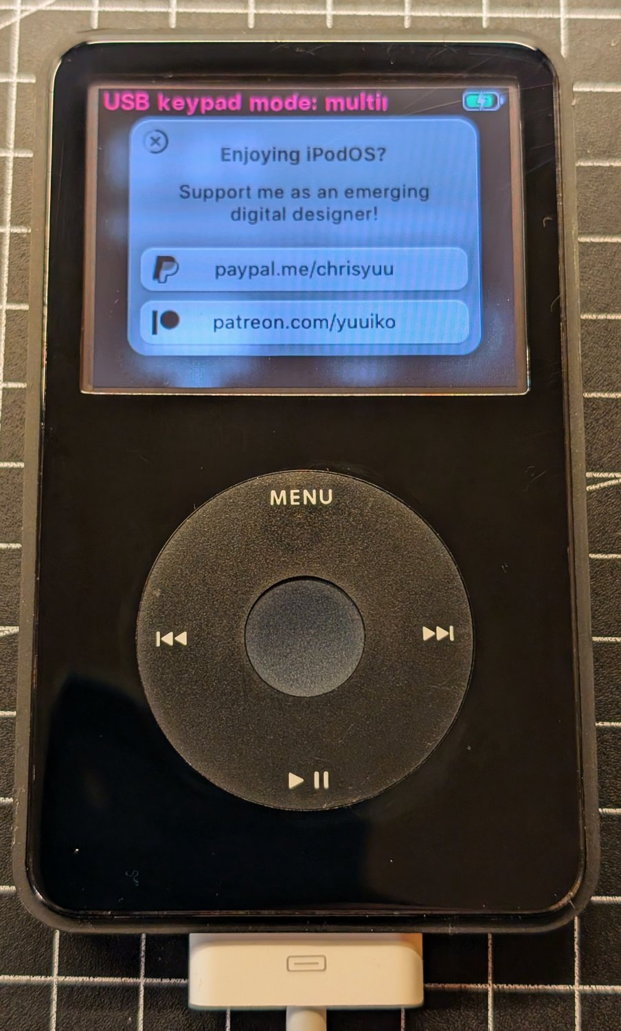 Merkwürdigerweise scheint der iPod nicht mehr der Ordner zu sehen, wo Apple die Musikdateien ablegt. Also schließe ich den iPod an und will Musik drauf kopieren. Der Ladescreen gefällt mir, aber nur sehr kurz. Den kaum will ich ein Bild machen, erscheint schon Werbung für den Ersteller des Themes. Das löst eher so eine negative Stimmung bei mir aus.